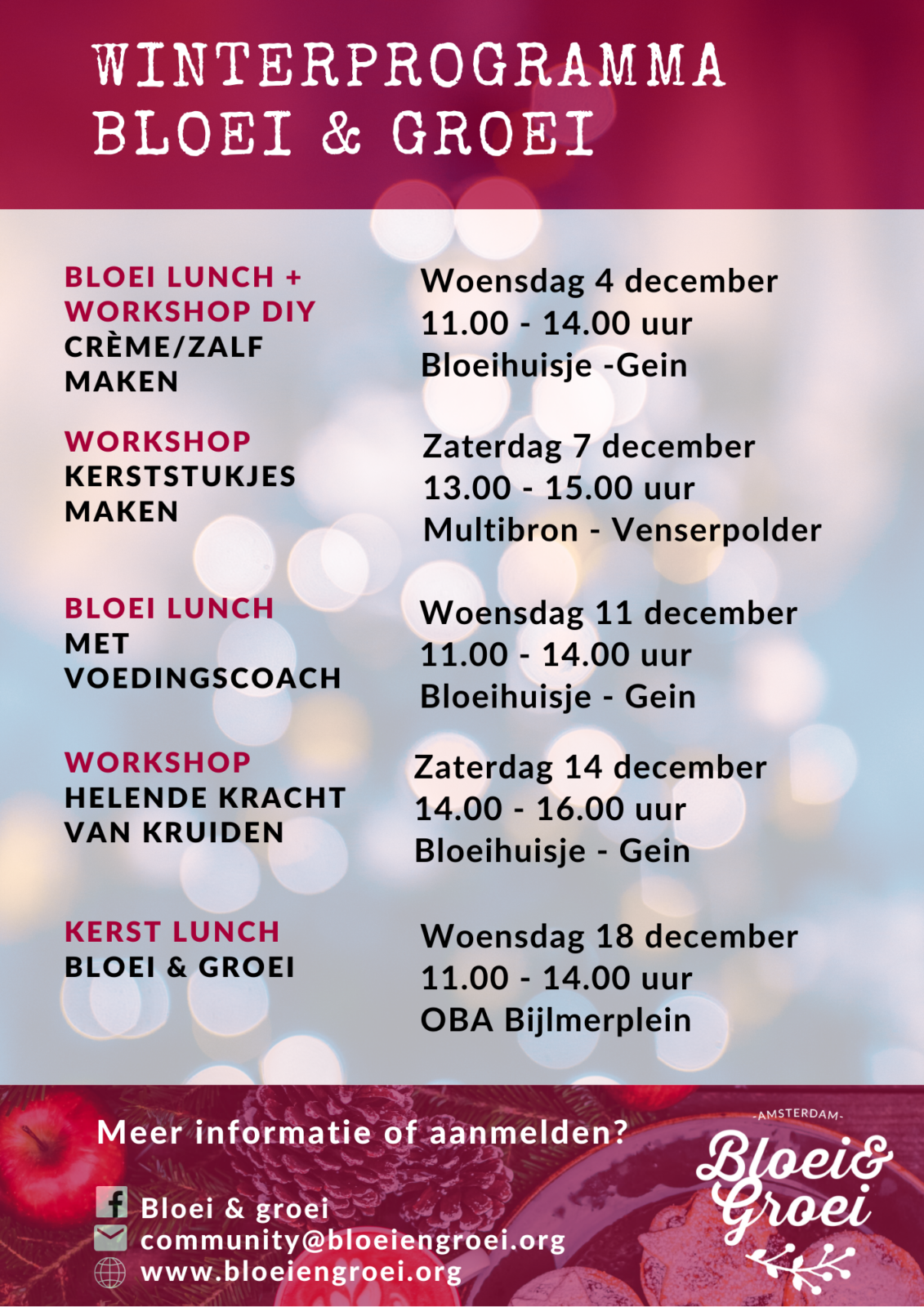 En daar zijn we trots op. Kijk maar eens wat er aankomende maand te doen is bij Bloei & Groei: van bloei lunches met een voedingscoach tot verschillende workshops zoals kerststukjes maken. De winter is een tijd waarin we samen zijn en tot bezinning komen. En vooral genieten van elkaars gezelschap!