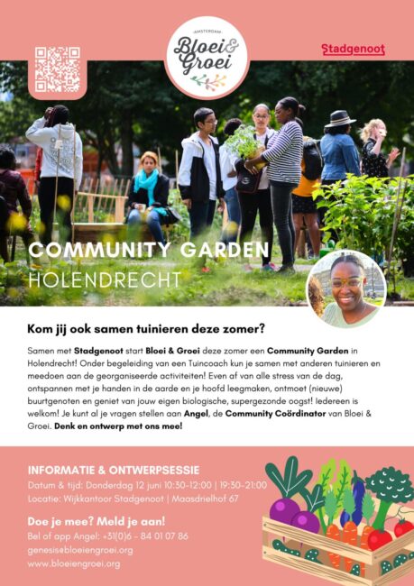 Samen met Stadgenoot start Bloei & Groei deze zomer een nieuwe Community Garden in Holendrecht! Onder begeleiding van een Tuincoach kun je samen met anderen tuinieren en meedoen aan de georganiseerde activiteiten.